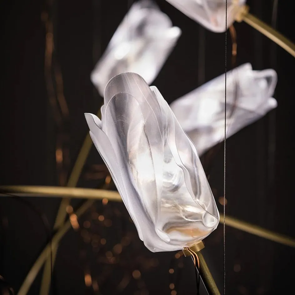 Een prachtig design met een sierlijke uitstraling. Deze 7-lichts LED hanglamp is voorzien van een brass metalen plafondplaat van 50 cm doorsnede. Over de plaat zijn evenredig 7 lichtpunten verdeeld. Aan ieder punt hangt een kap in de vorm van een tulp. In de knop van de tulp is een G4 LED lichtbron verwerkt, deze zijn inclusief. Dit zorgt voor een prachtig effect in de bloemen. De tulpen worden onderling verbonden om de stroomtoevoer door te zetten. Op deze wijze ontstaat er een prachtig ontwerp dat er van iedere kant anders uit komt te zien. De sierlijke hanglamp heeft een maximale hoogte van 330 cm wat de lamp prima geschikt maakt voor een ruimte met een hoog plafond of een vide. De LED hanglamp is dimbaar middels een externe dimmer (exclusief).