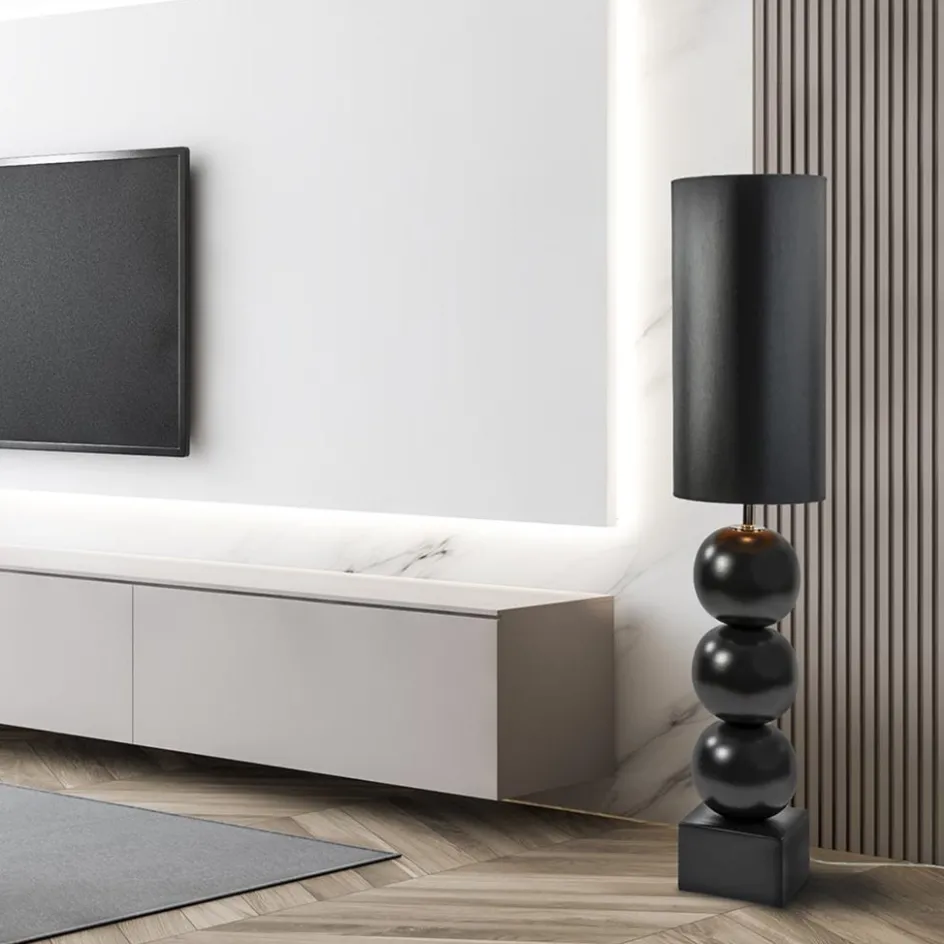 Een elegante toevoeging voor een strak klassiek of hotel chic interieur. De lampvoet is volledig gemaakt van keramiek en is uitgevoerd in het mat zwart. Dit geeft de staande lamp een luxe uitstraling die compleet wordt gemaakt door de grote ronde kap in het zwart/goud. Deze wordt ondersteund door een fitting met kogelgewricht zodat u de kap gemakkelijk recht kunt zetten. De vloerlamp met bollen is voorzien van een transparant snoer met een lengte van 200 cm. De schakelaar bevindt zich op 80 cm van de voet. De chique vloerlamp met kap wordt exclusief lichtbron geleverd.