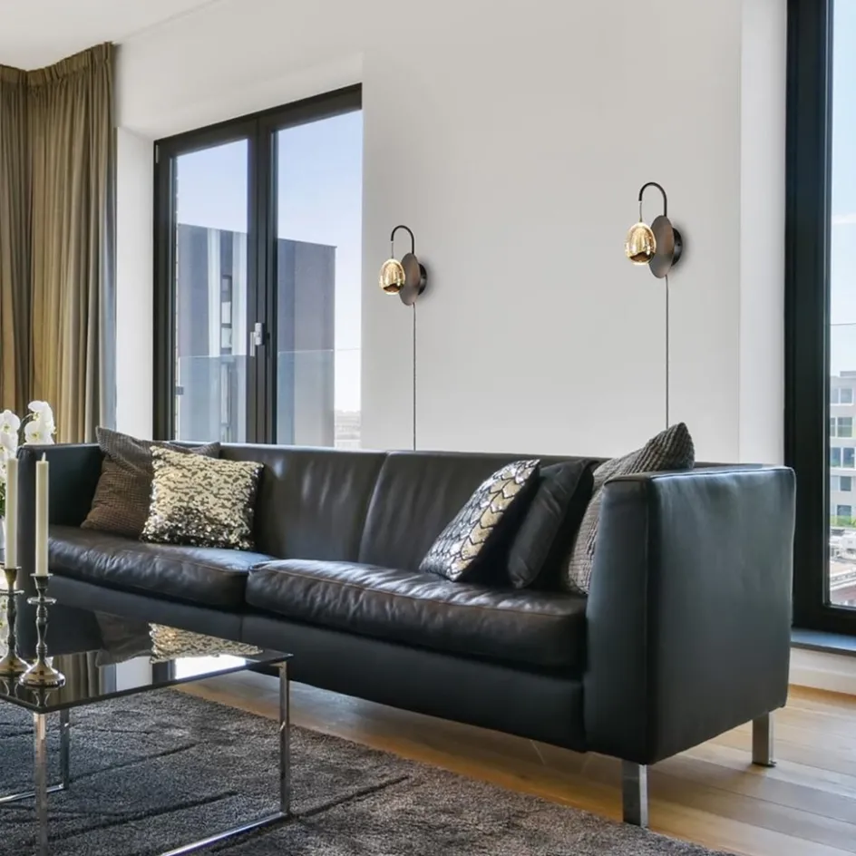 Een sfeervolle toevoeging voor in de woonkamer, hal of slaapkamer. De kap is gevormd als een ei en voorzien van LED verlichting. De kap is deels van massief glas en goudkleurig metaal. Het frame is mat zwart. Dit geeft de wandlamp een luxe uitstraling. Het glas is voorzien van luchtbelletjes wat de wandlamp een speels effect geeft. De verlichting geeft direct licht naar beneden door middel van de spot onderop het ei, en daarnaast ook indirect licht doordat het ei van binnenuit verlicht wordt. De wandlamp wordt met een snoer en stekker geleverd waardoor de lamp alleen maar opgehangen hoeft te worden.